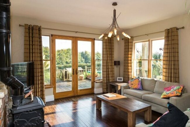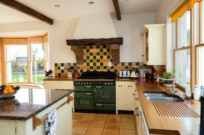 The kitchen has an island and a range style stove as well as lots of floor and wall cabinets for plenty of space. There is also floor to ceiling glazing, access to the garden and exposed beams in the ceiling.