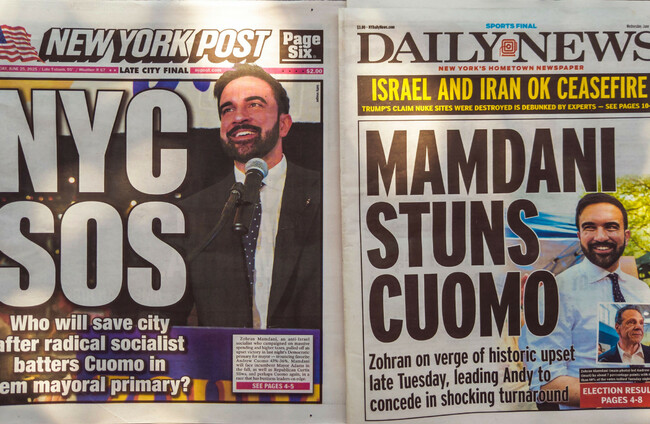 Front pages after Mamdani beat Cuomo in the democratic primary. Alamy Stock Photo