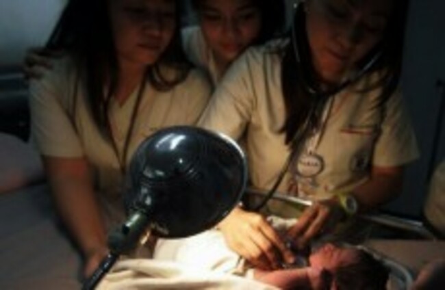 Nurses attend to a newborn baby found inside a bin at Manila's international airport, Philippines.