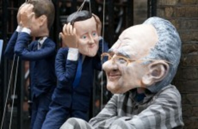 Puppets of Nick Clegg, David Cameron and Rupert Murdoch outside Murdoch's home in London this morning. Jeff Moore/Jeff Moore/Empics Entertainment