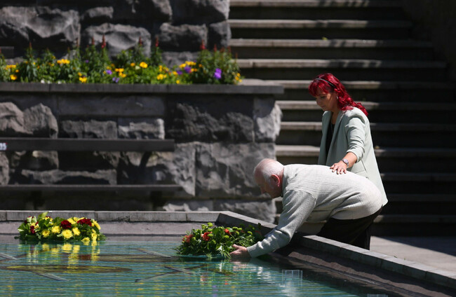 Family members lay wreaths during a Stardust ceremony of commemoration at the Garden of Remembrance in Dublin. PA