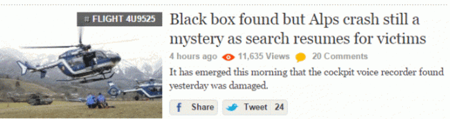 1. #FLIGHT 4U9525: The search is continuing for bodies of victims of the Germanwings plan crash in the French Alps, with news the blackbox found yesterday was damaged on impact.