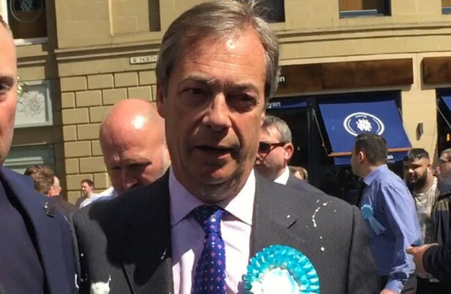 A MAN WHO threw a milkshake over leader of the Brexit Party and British MEP Nigel Farage during a political campaign tour has been ordered to pay compensation.