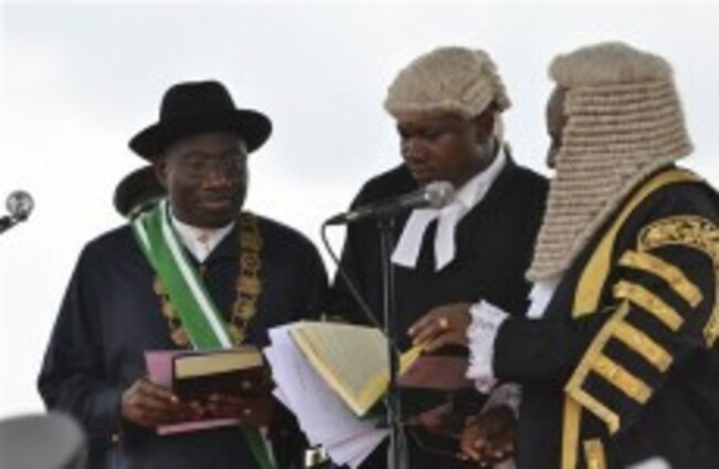 Nigerian President Goodluck Jonathan, left, takes the oath of office before Justice Sunday Olorundanusi, center, and Chief Justice of Nigeria Katsina Alu during his inauguration ceremony. AP Photo/Felix Onigbinde