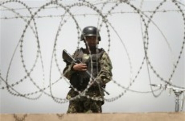 An Afghan soldier is seen through the barbed wires, standing guard on a roof of one of the gates to Kabul's airport following a shooting incident on Wednesday April 27, 2011, in Kabul, Afghanistan. AP Photo/Musadeq Sadeq