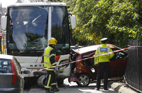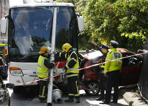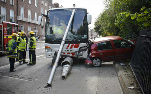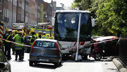 The crash occurred after 9am on Merrion Square North in Dublin, when a coach collided with two parked cars. All vehicles were extensively damaged in the incident, with one of the cars being forced into the nearby railings of the square.