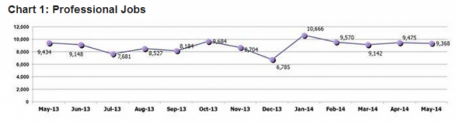The employment monitor showed a small drop of 1% in job availability during May, with another decrease of 1% in the number new professional vacancies compared to the same month in 2013.
