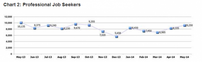 Meanwhile, there was an 11% jump in the number of professionals looking for new job opportunities when compared to April, but the number of job-seekers was still down by 9% compared to last year.