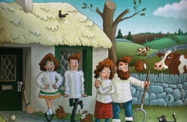 In the exercise showing two families, one family is a ‘stereotypically Irish family’ that doesn’t interact with anyone or anything not from Ireland. The illustration shows them wearing woolen jumpers and living in a thatched cottage.