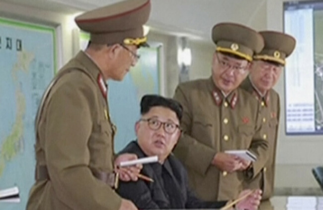 The North’s official KCNA news agency said Kim was briefed on the “plan for an enveloping fire at Guam” during an inspection yesterday of the Strategic Force command in charge of the nuclear-armed state’s missile units.