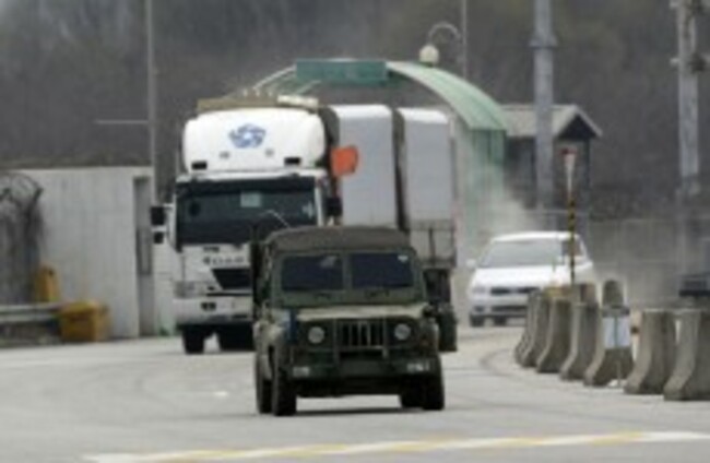 South Korean vehicles returning home from North Korea's Kaesong complex are escorted by a South Korean military. Lee Jin-man/AP
