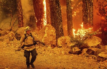 A firefighter walks a path as the Glass Fire burns along Highway 29 in Calistoga, California Noah Berger/PA Images
