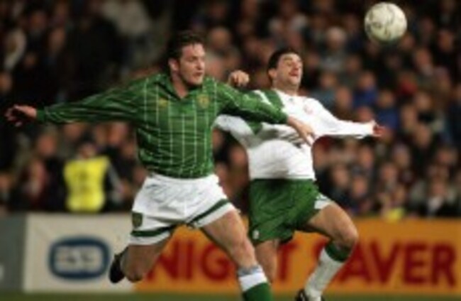 John Aldridge (R) and Gerry Taggart (L) battle for the ball in one of the most famous clashes between the Republic and the North in 1993 ©INPHO/Billy Stickland