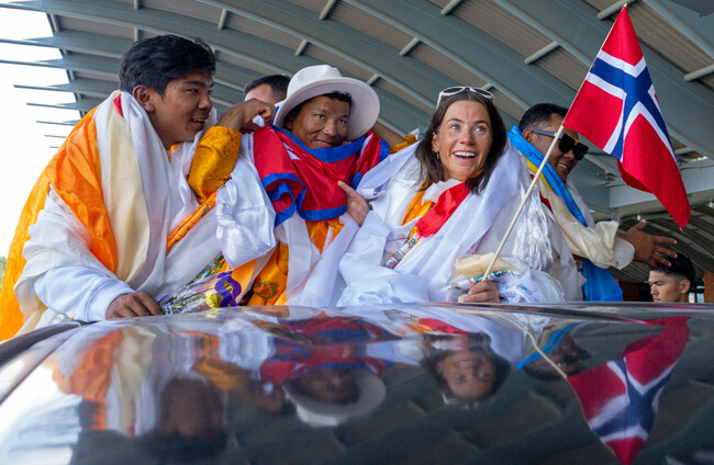Norwegian climber Kristin Harila, right, and her Nepali sherpa guide Tenjen Sherpa, center, who climbed the world's 14 tallest mountains in record time, Aug. 5. Alamy Stock Photo