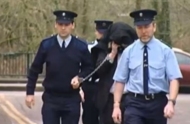 McGrath being led away from court during the murder case of Sylvia Roche Kelly. RTÉ Screengrab
