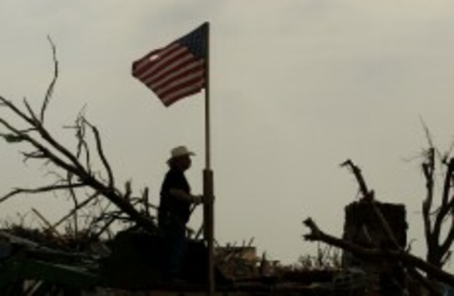 One man raises the American flag as he helps clean up the devastation. Charlie Riedel/AP/Press Association Images