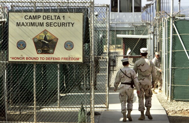 US military guards walk within Camp Delta military-run prison, at the Guantanamo Bay US Naval Base, Cuba.