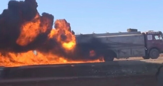 The video, which says in the title that this is the aftermath of a Russian airstrike on a number of oil trucks on a trade route near Aleppo, starts off with plumes of smoke coming from three oil trucks.