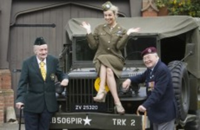 Irish World War II veterans, Captain James Riordan and Sergeant Johnny Wetherall - and model Pippa O'Connor - pose in 2010. Legislation introduced today will formally pardon Irish Army staff who deserted to fight with the Allies in WW2. Eamonn Farrell/Photocall Ireland