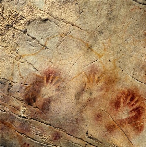 New tests show that crude Spanish cave paintings of a red sphere and handprints are the oldest in the world, so ancient they may not have been by modern man. (AP Photo/Pedro Saura, AAAS)