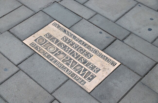 Memorial plaque at Sveavagen street in Stockholm, where Olof Palme was assassinated. Shutterstock/Tupungato