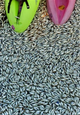 The fish stacked between 12- to 18-inches deep in some spots. The fished died when they apparently depleted the water of oxygen and suffocated after getting lost in the marina, officials said. Despite a daylong effort on Tuesday to scoop up fish in nets and buckets, the cleanup can take up to a week and the smell is  expected to get a whole lot worse.