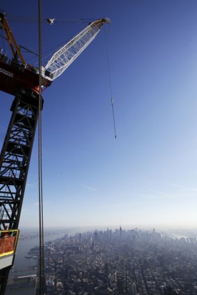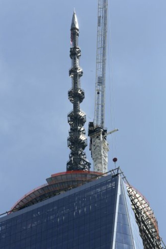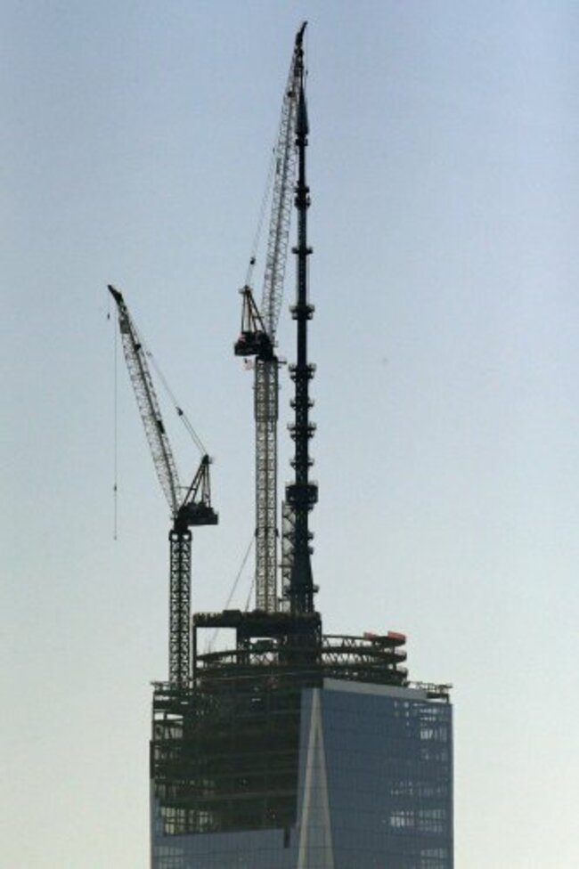 CONSTRUCTION WORKERS IN New York cheered today as the final piece of the 124 metre spire for One World Trade Centre was hoisted into place.