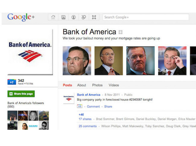 BofA’s Google Plus profile bashes the already embattled Charlotte, North Carolina-based bank. The page, which is no longer available, features unflattering pictures of former CEO Ken Lewis and mocking wall posts.