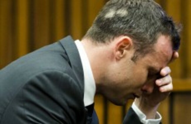 Oscar Pistorius puts his hand to his face while listening to cross questioning about the events surrounding the shooting death of his girlfriend Reeva Steenkamp AP Photo/Theana Breugem