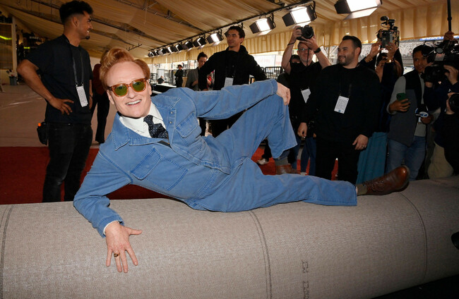 Host Conan O'Brien literally rolls out the red carpet. Alamy