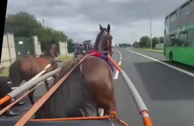 The footage from a road in west Dublin shows a number of people riding horses, while others are driving traps led by horses. One horse crashes head first into a car, after the trap driver loses control. The horse survived.