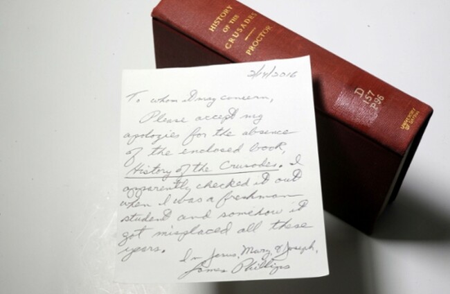 “Please accept my apologies for the absence of the enclosed book History of the Crusades. I apparently checked it out when I was a freshman student and somehow it got misplaced all these years,” the note reads.