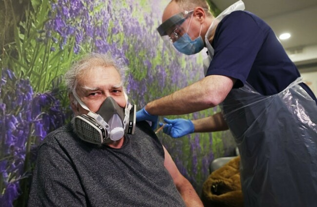 John Grey receives the first of two doses of the Oxford/AstraZeneca Covid-19 vaccine at Falls Surgery in Belfast. Liam McBurney/PA