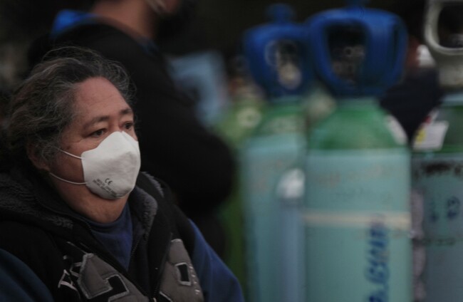 A person waits in line to be able to refill an oxygen tank, Mexico City. Eyepix/ABACA
