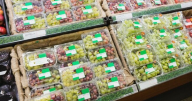 Grapes in plastic packaging on supermarket shelf. Shutterstock/wavebreakmedia