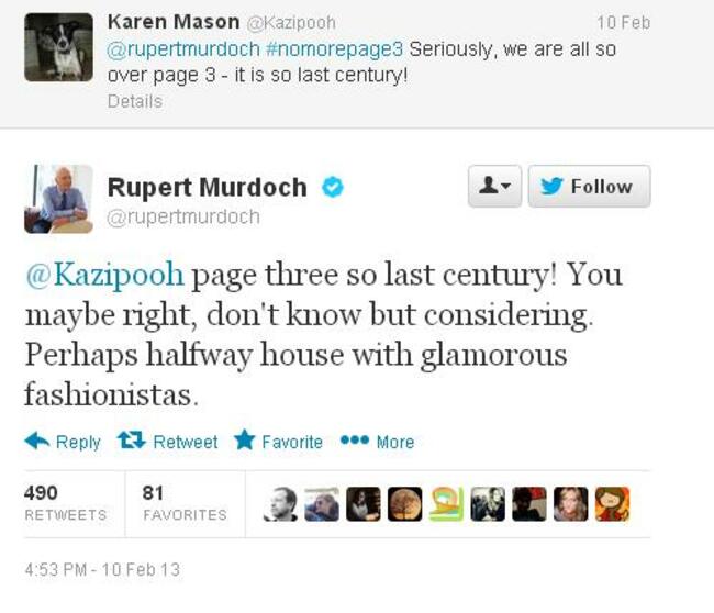 Murdoch made the comment on Twitter yesterday after being bombarded with tweets from the No More Page 3 campaign, whose followers are appealing for the daily topless photos of young women to be removed from The Sun.