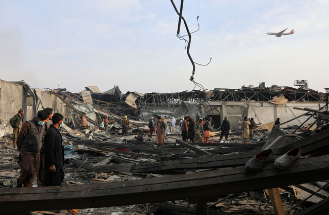 Residents and volunteers inspect the site of a late-Monday airstrike at a drug rehabilitation hospital in Kabul, Afghanistan. Siddiqullah Alizai/AP