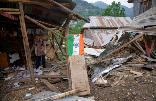 An Indian flag lies in front of a damaged shop following an overnight artillery shelling from Pakistan at Gingal village in Uri district, Indian controlled Kashmir (Dar Yasin/AP)