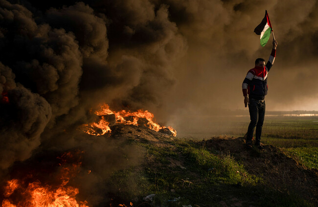 Palestinians burn tyres and wave the national flag during a protest against a Israeli military raid in the West Bank city of Jenin, along the border fence with Israel, east of Gaza City (Fatima Shbair/AP)