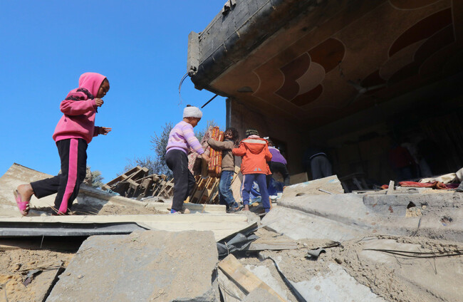 Palestinian children search for their belongings after an Israeli strike destroys their home in Dair El-Balah, Gaza Strip, 7 February, 2024. Omar Ashtawy
