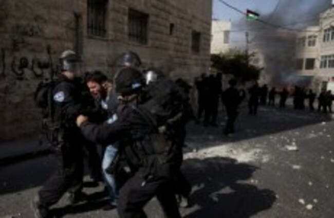 Israeli troops arrest a Palestinian protester, during a demonstration to mark the 63rd anniversary of "Nakba", Arabic for "Catastrophe". Oded Balilty/AP/Press Association Images