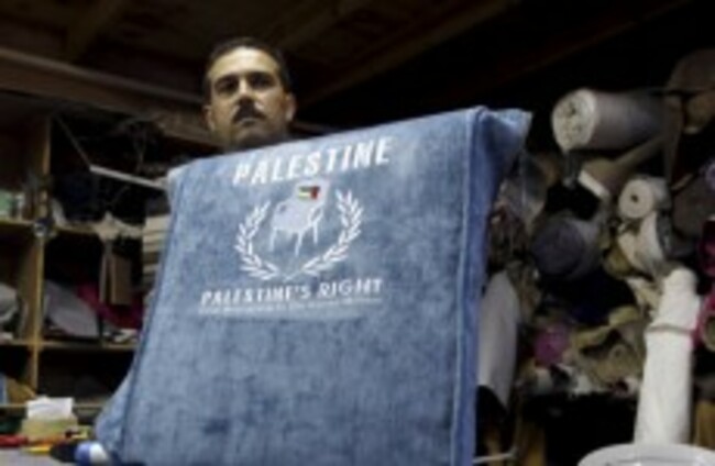 A Palestinian worker shows a special chair made to mark the Palestinian push for UN recognition. AP Photo/Mohammed Ballas