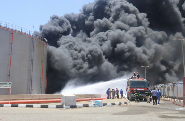 Firefighters battling a fire at a fuel depot in Port Sudan after the strikes Alamy