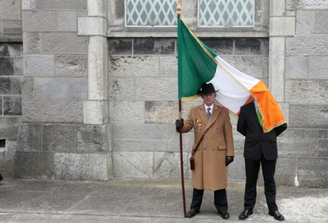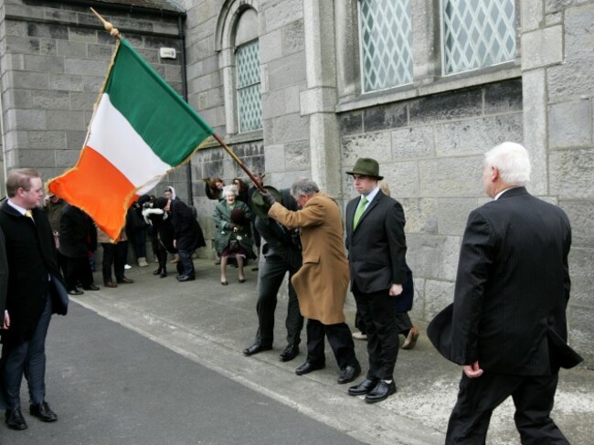 STANDING FIRM AS he becomes enveloped in the tricolour, this unidentified man was in attendance at the annual Fianna Fáil 1916 commemoration in Arbour Hill today.