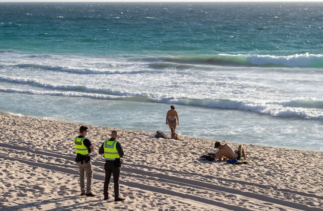 Police officers patrol Scarborough Beach in Perth just after a lockdown was announced today. Richard Wainwright/AAP/PA Images