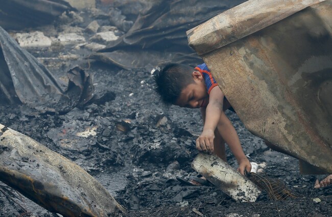 A boy retrieves some items following an early morning fire that engulfed the poor neighbourhood of Tondo, a district in Manila, while celebrating the New Year. Bullit Marque/Press Association Images