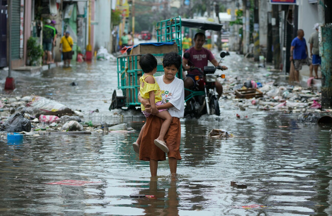 A woman and child crosses a flooded street in Navotas, Philippines. Alamy Stock Photo