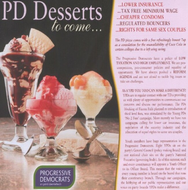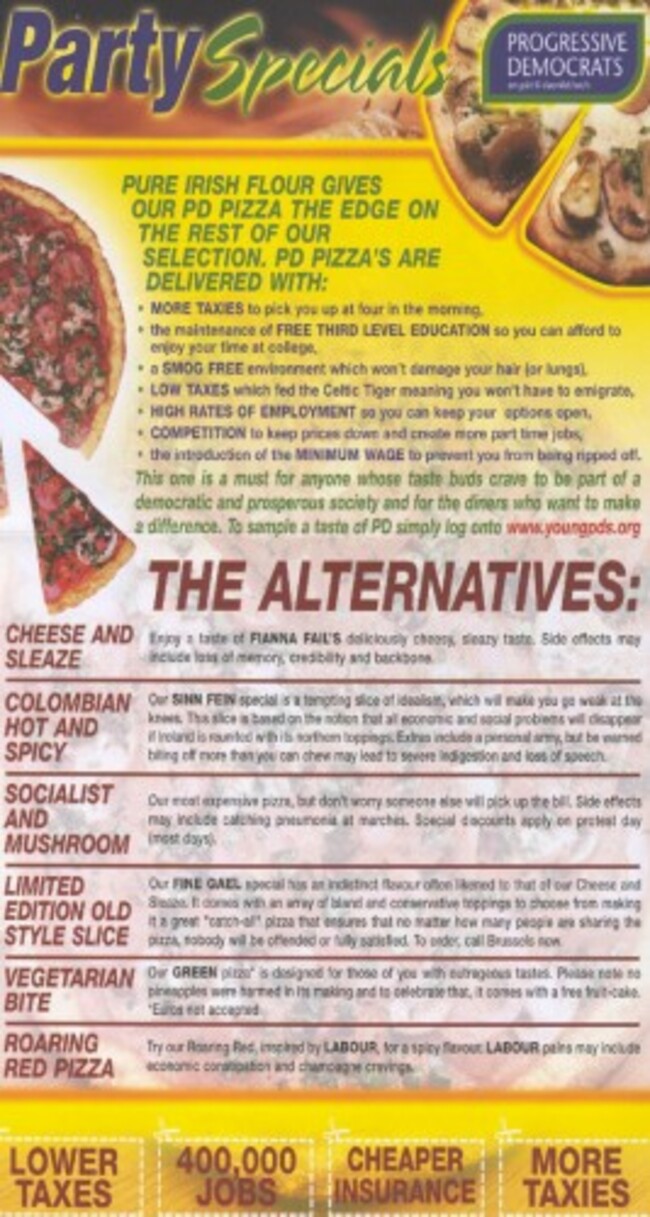 Sent around in the mid-2000s, the leaflet (via some pretty poor Photoshopping) depicts the Progressive Democrats’ Mary Harney, Michael McDowell, Tom Parlon and Liz O’Donnell as chefs in charge of what looks like a mid-sized pizza restaurant.