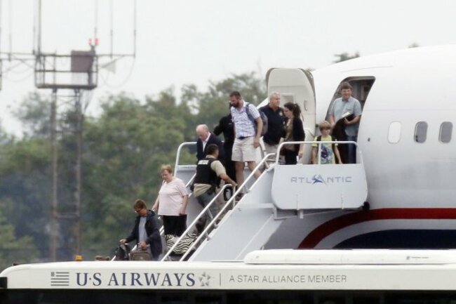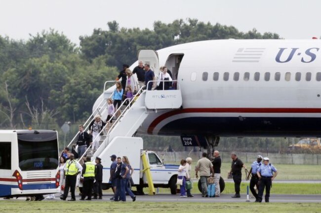 Law enforcement officials met the plane on the tarmac and passengers exited the jet to waiting buses where they were taken to the main terminal building.