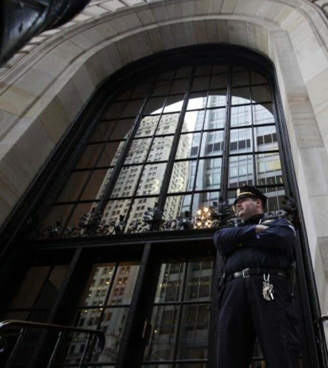A Federal Reserve police officer stands in front of the Federal Reserve Building today. (AP Photo/Frank Franklin II)
